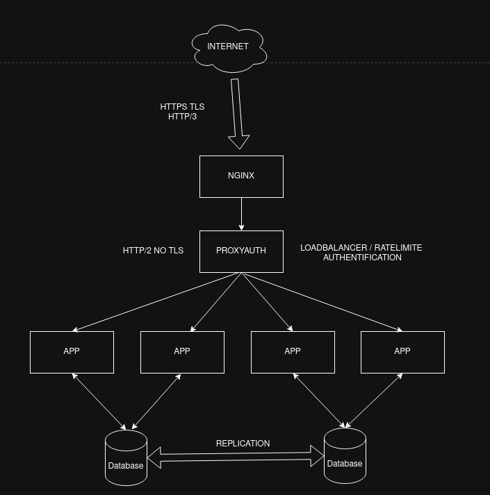In infrastructures where NGINX already manages TLS termination or HTTP/3 support, ProxyAuth takes place behind it, connected over HTTP/2 without TLS overhead inside the network boundary.