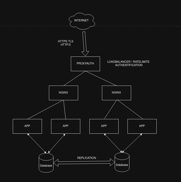 Behind it, multiple NGINX instances fan out traffic across applications while maintaining performance isolation. Databases replicate to avoid single points of failure.